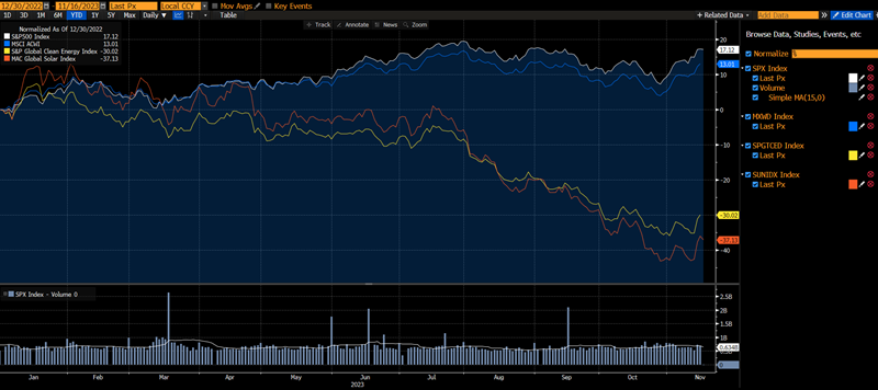 - While the S&P500 and MSCI ACWI are up mid-teens % YTD, clean energy indexes are down -30 to -40%