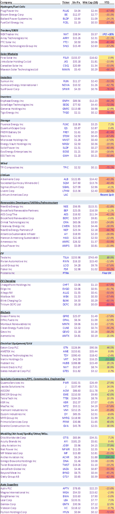 None of this should be construed as investment advice and all opinions are my own personal macro observations. None of the below consists of independent stock opinions nor will I ever provide that. After a turbulent earnings season for cleantech, I thought I'd write this post as a follow up to my prior post about what's going on with renewables stocks YTD. In 3Q23, many cleantech subsectors continued poor performance with execution issues, guidance cuts, and weaker near-term outlooks. For many names with mixed or negative performance, there was further pressure on stock prices on top of already significant YTD weakness. Street estimates are moving lower and valuations continue to compress. However, the rate-sensitive nature of these names continues to be an interesting dynamic as many names jumped up the past few days on bullishness around better inflation data and a more favorable outlook on rates. While the near-term outlook and sentiment for many cleantech names has weakened, the multi-year, secular tailwinds (e.g., move to renewables, electrification of everything, decarbonization of the economy) are still intact even though their trajectories will be modified to resemble a more realistic pace for the energy transition. As sellside adjusts estimates downward and move to more reasonable valuation frameworks relative to the 2020-2022 period, favorable setups may emerge in the coming quarters as end markets recover and investors build conviction that end markets conditions have bottomed out. General Commentary: