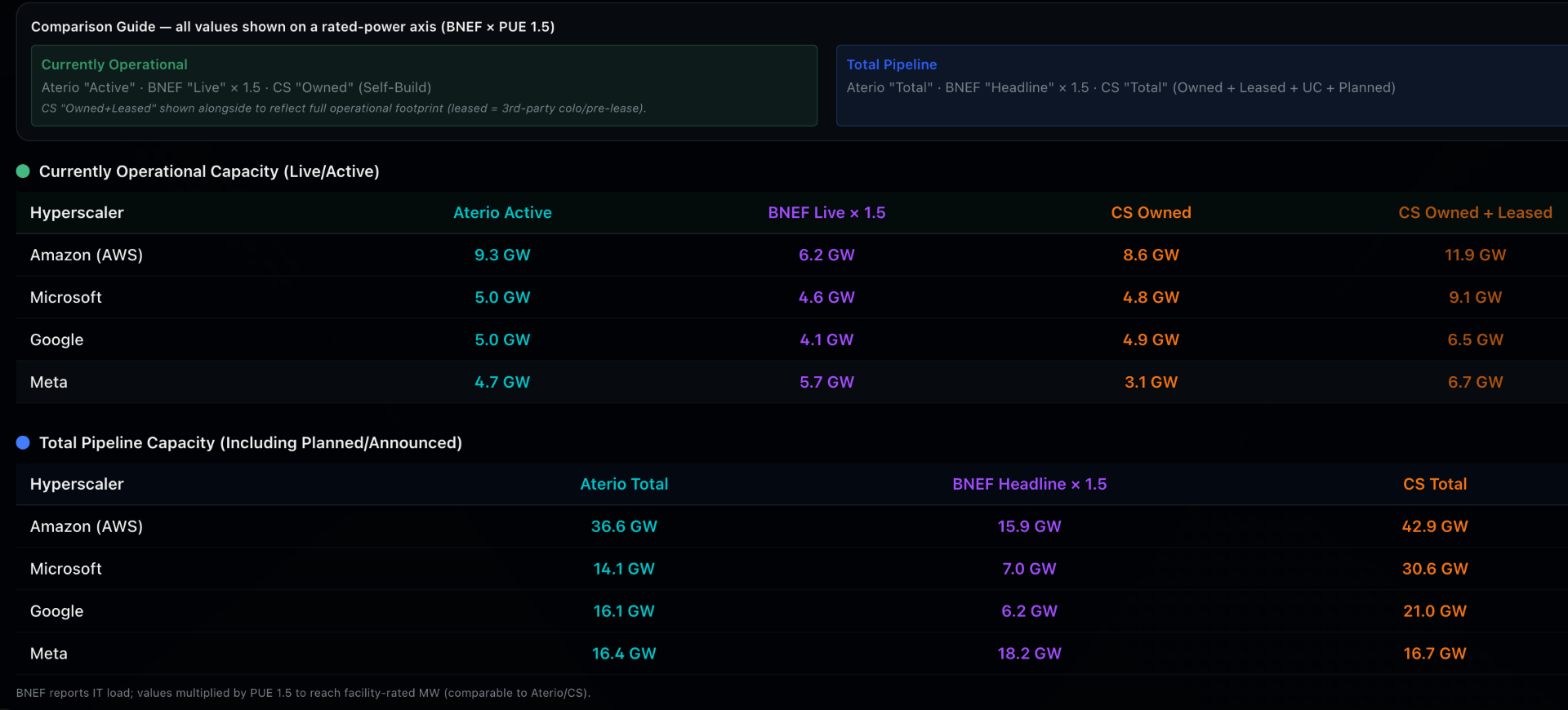 Hyperscaler disclosures on physical delivery: As discussed, these are a mix of US and global figures, and facility power vs. IT load definitions vary across companies, so hard to compare apples-to-apples but worth detailing.