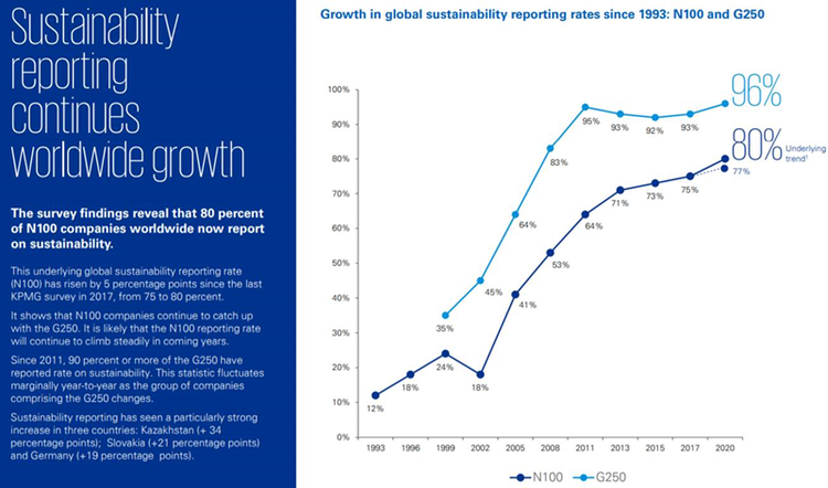 - The 2020 KPMG Survey of Sustainability Reporting revealed the continued growth of sustainability reporting among the world’s largest companies. While there remains a lot to be desired on mapping to materiality and cutting through the noise, reporting and datasets should improve as standards evolve and as more companies get their reports audited by third parties.