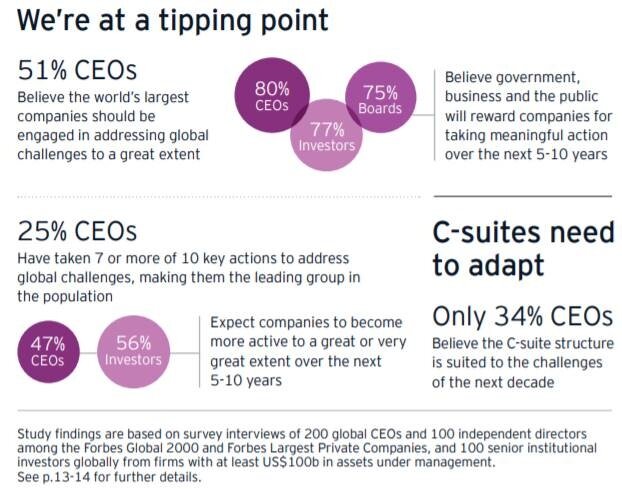 - The 2019 EY CEO Imperative Study states that 80% of CEOs believe government, business and the public will reward companies for taking meaningful action over the next 5–10 years.