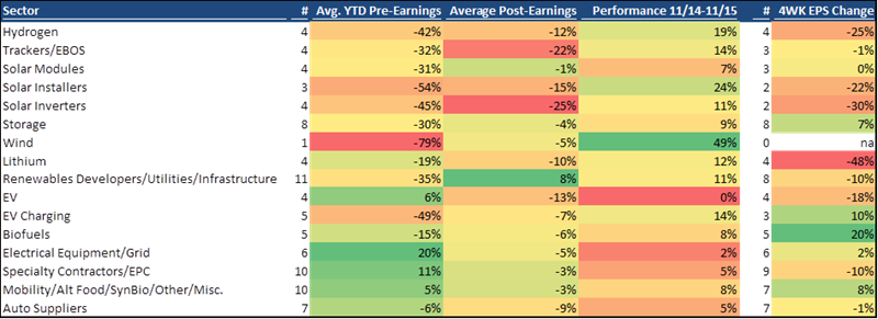None of this should be construed as investment advice and all opinions are my own personal macro observations. None of the below consists of independent stock opinions nor will I ever provide that. After a turbulent earnings season for cleantech, I thought I'd write this post as a follow up to my prior post about what's going on with renewables stocks YTD. In 3Q23, many cleantech subsectors continued poor performance with execution issues, guidance cuts, and weaker near-term outlooks. For many names with mixed or negative performance, there was further pressure on stock prices on top of already significant YTD weakness. Street estimates are moving lower and valuations continue to compress. However, the rate-sensitive nature of these names continues to be an interesting dynamic as many names jumped up the past few days on bullishness around better inflation data and a more favorable outlook on rates. While the near-term outlook and sentiment for many cleantech names has weakened, the multi-year, secular tailwinds (e.g., move to renewables, electrification of everything, decarbonization of the economy) are still intact even though their trajectories will be modified to resemble a more realistic pace for the energy transition. As sellside adjusts estimates downward and move to more reasonable valuation frameworks relative to the 2020-2022 period, favorable setups may emerge in the coming quarters as end markets recover and investors build conviction that end markets conditions have bottomed out. General Commentary: