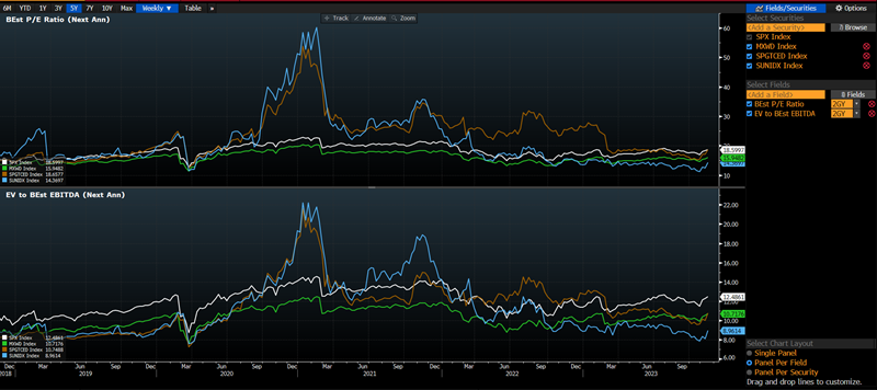 - Valuation for the clean energy indices was a significant premium through 2020-2022 and now has de-rated to being at a discount to the S&P500 and MSCI ACWI