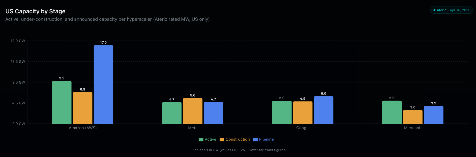 - Meta (MSL): Guided $115-135B in 2026 capex, materially higher than 2025. Self-build pipeline includes the 1 GW Prometheus campus in Ohio coming online in 2026, with longer-dated builds at the 1 GW El Paso campus (investment scaled from $1.5B to $10B, targeting 2028), the 1 GW Lebanon, Indiana campus, and the Louisiana JV with Blue Owl (~$27B, scalable to 5 GW). On top of the self-build, Meta has committed $35.2B to CoreWeave across two deals for third-party capacity, though only the original $14.2B Sept 2025 deal is relevant to near-term 2026/2027 capacity; the additional $21B April 2026 expansion runs 2027–2032 and includes early Vera Rubin deployments.