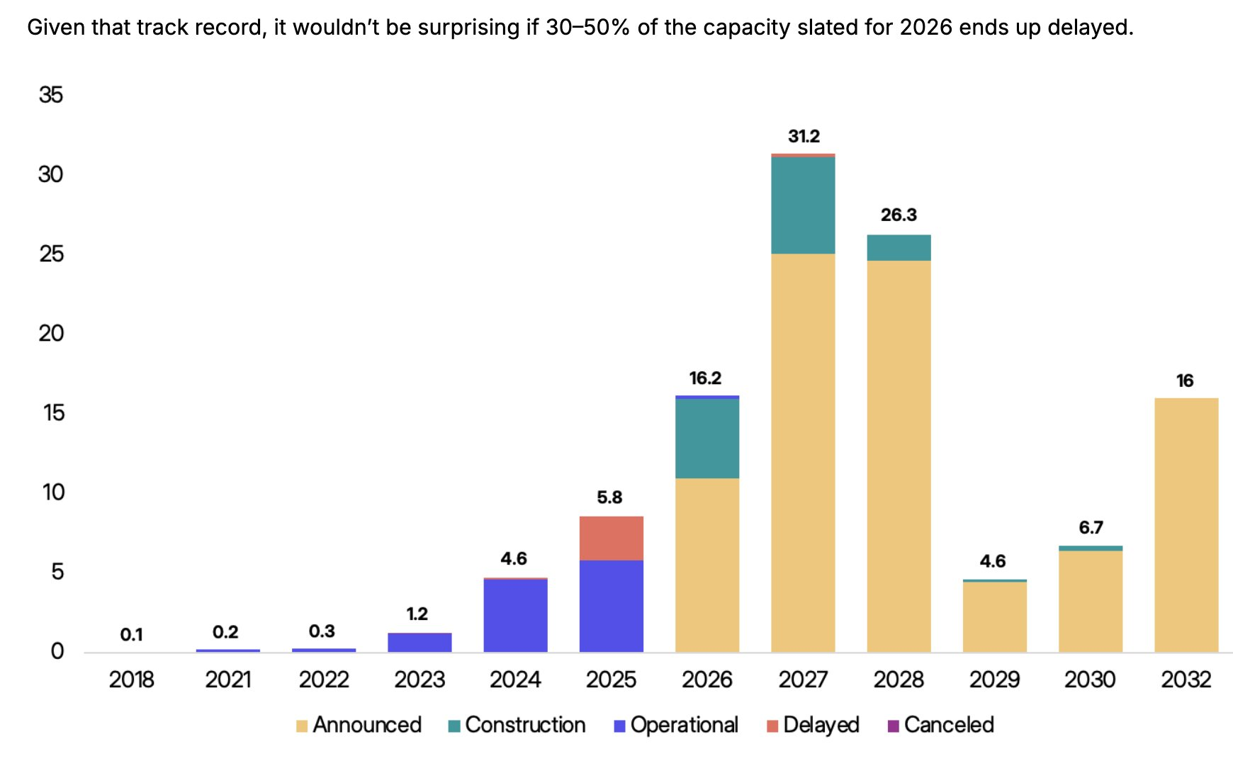 - Sightline: Shows at least 16 GW of US data center capacity slated to come online in 2026 across 140 projects but warns 30-50% may face delays due to power constraints and equipment shortages.