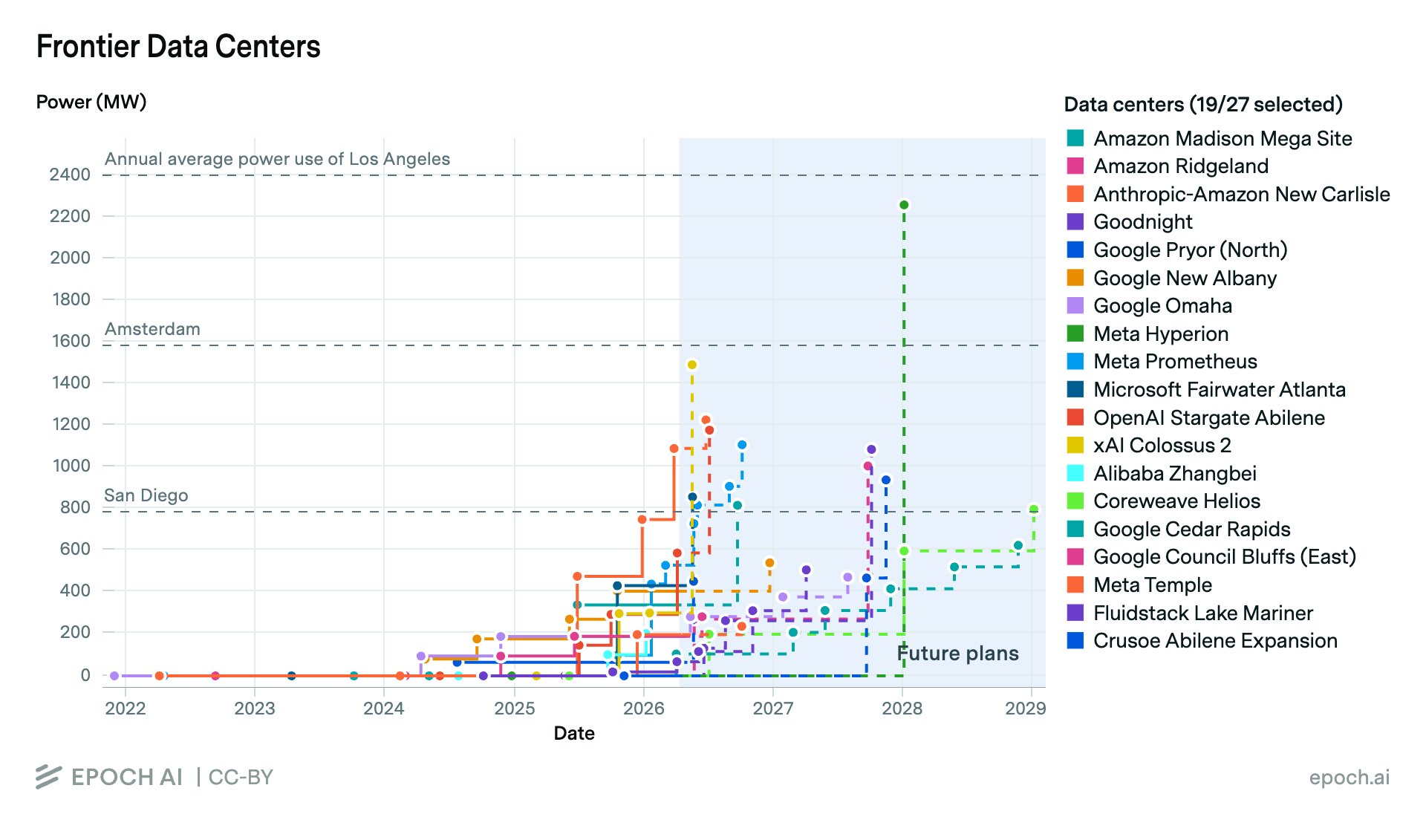 - Epoch AI: Frontier data center tracker confirms the step-function: most of the largest campuses (e.g., Meta Hyperion at 2.2 GW, Microsoft Fairwater above 1 GW) don't fully arrive until 2027-2028. They also track chip data and show ~13 GW cumulative power capacity across all providers since 2021.